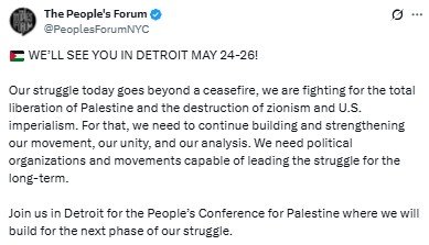Along with the Palestinian Youth Movement, TPF was one of the organizers of the 2024 “People’s Conference for Palestine.” Ahead of the event, TPF published a post saying, “we are fighting for the total liberation of Palestine and the destruction of zionism and U.S. imperialism”.[37]